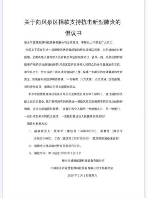 當(dāng)前,舉國上下正在進(jìn)行一場(chǎng)應(yīng)對(duì)新型冠狀病毒肺炎疫情的防控阻擊戰(zhàn)。為支持疫情防治,2月1日新鄉(xiāng)市誠德能源科技裝備有限公司和公司黨支部通過公司的微信平臺(tái)發(fā)出捐款倡議書,在向總、黨員和各部門干部的帶領(lǐng)下,廣大員工積極奉獻(xiàn)愛心,為疫情貢獻(xiàn)自己的力量。